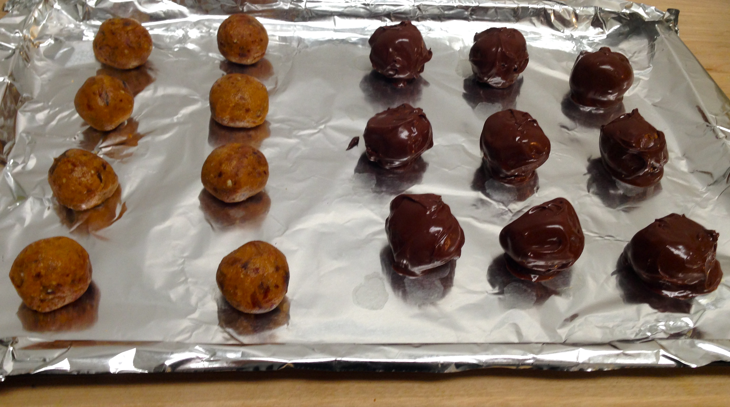 6. Take peanut butter balls from the fridge (they should be somewhat cool and solidified) and, using one at a time, roll each ball in the chocolate mixture, using a small spoon. Scoop ball up with spoon after it is coated and place back on baking sheet. Repeat for as many as you’d like dipped in chocolate!